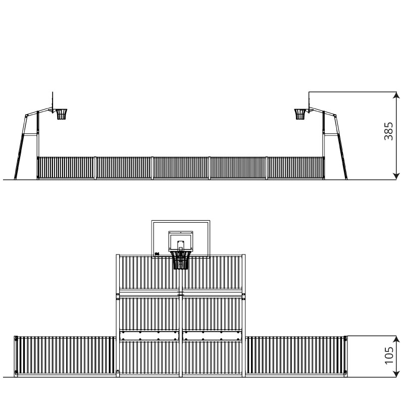 Peliareena ulkokäyttöön erilaisiin pallopeleihin. Peliareenassa korotetut päätyseinät. Peliareenan mukana tulee koripallotelineet.